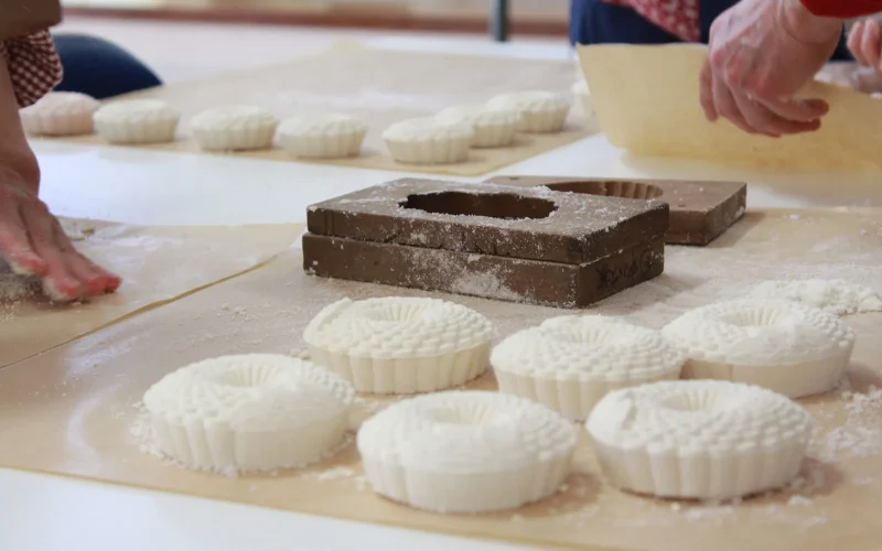 「これを木型に押し込んで、こうしてこうしなさい。」木型に粉をググッと押し込み、反対にひっくり返してトントンと木型を叩くと、真っ白な落雁が木型から外れました。ふんわりと甘い香りが漂います。