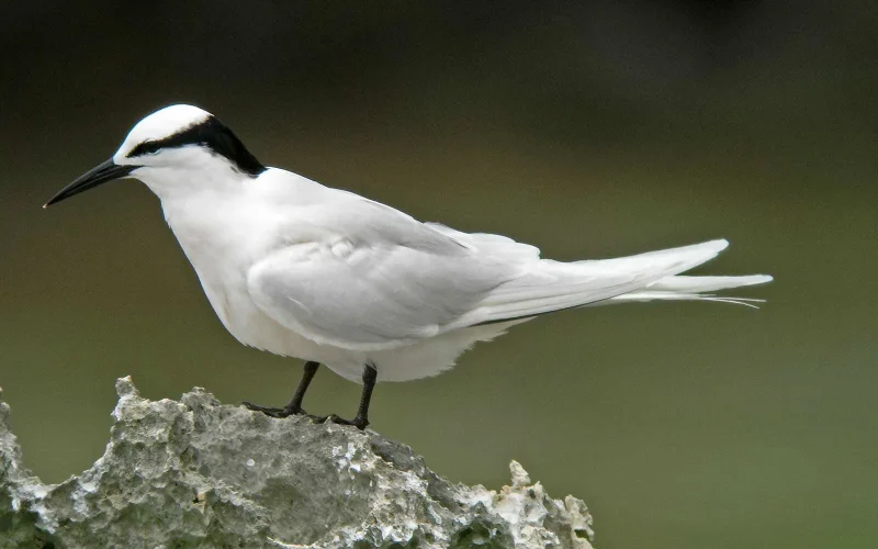 エリグロアジサシは、全長およそ30cmのカモメ科の海鳥です。全身はほぼ真っ白ですが、人で言う襟足にあたる後頭部が黒いことから、この名がつけられました。目もとは黒いラインがきゅっと入り、どこかきりりとした、精かんな顔立ちをしています。細長い翼をはばたかせて軽やかに舞う姿はとても優雅で、なんとも爽やかな印象の鳥です。