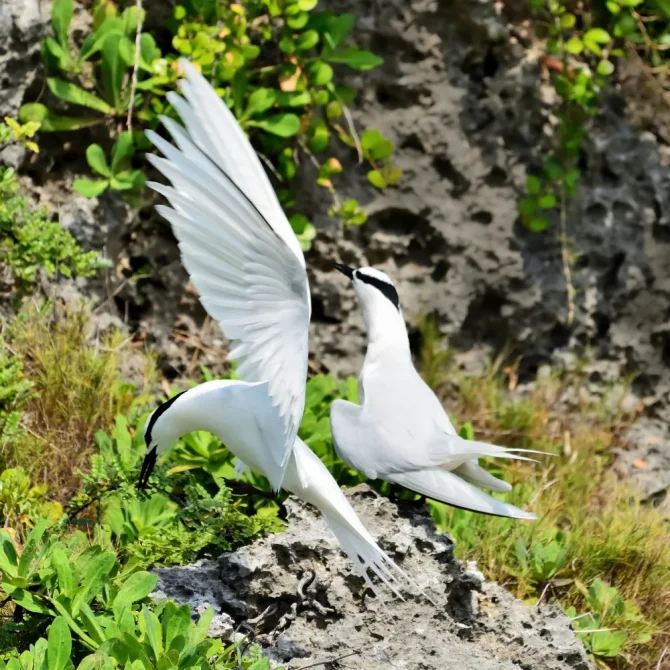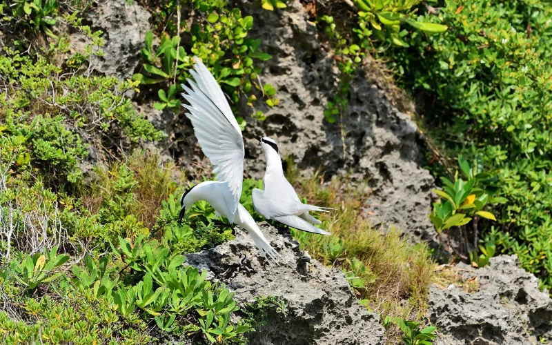 エリグロアジサシが日本に姿を見せるのは、八重山諸島では5月中旬ごろ。海岸から少し離れた小島や磯のくぼみに巣を作り、数羽から多くても30羽ほどの小さな集団で子育てをします。こうした場所は人がほとんど近づかないうえに、ネコやヘビといった天敵も入り込めないため、安心して繁殖できるのでしょう。