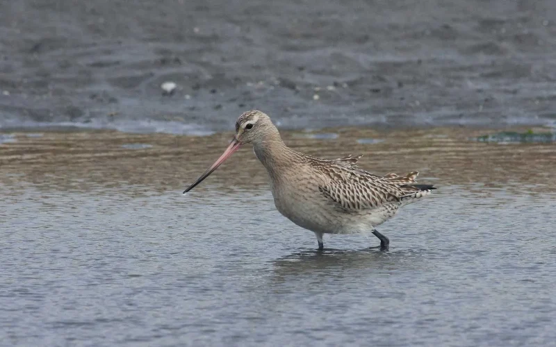 私自身も、この鳥の驚異的な力を実感した体験があります。それは春のこと。東京湾の三番瀬という干潟で2羽のオオソリハシシギに出会いました。春ですから、秋とは逆に越冬地から繁殖地へ向かう途中に立ち寄った個体です。