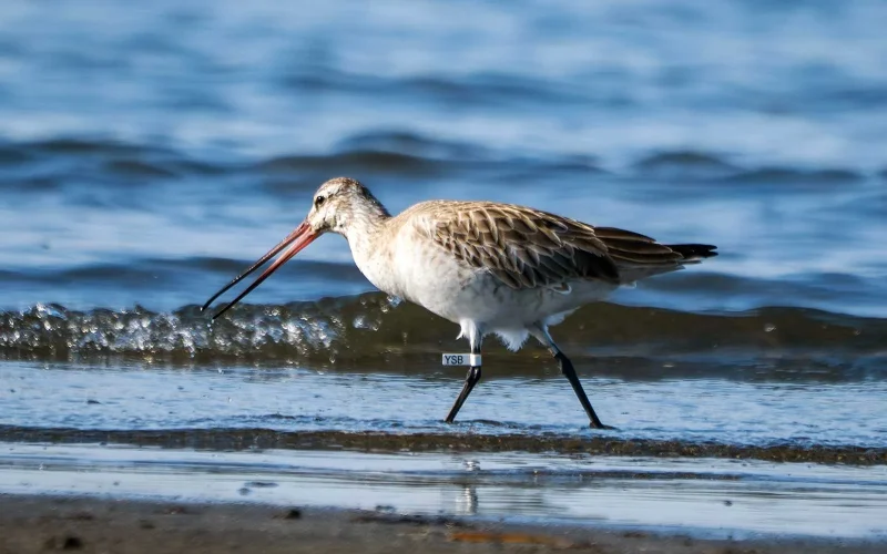 双眼鏡で観察していると、足に白いものがついているのに気づきました。それは標識調査のために取り付けられた「フラッグ」と呼ばれるもので、文字や数字が記されており、その鳥がどこから来たのかを知る手がかりになります。その鳥には「YSB」と記されたフラッグが付いていました。