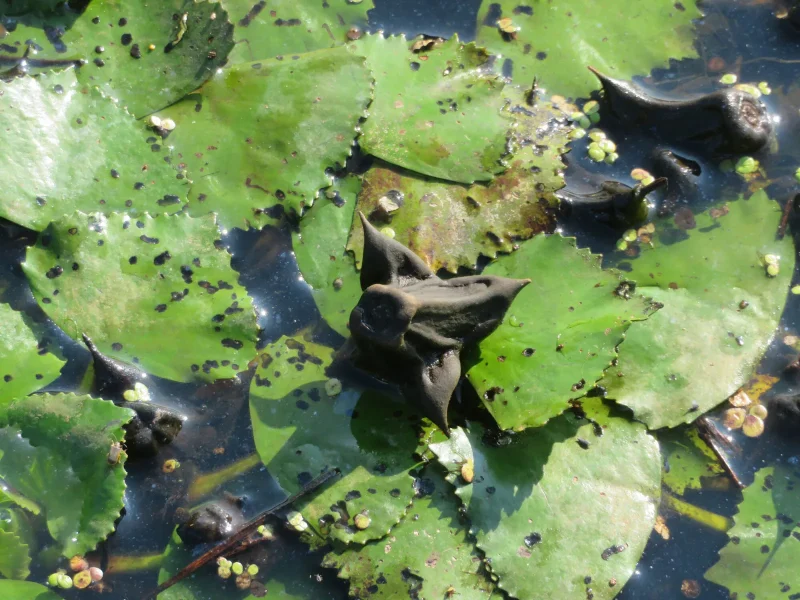 春になると茎が伸びて、三角形の葉が水面に浮かびます。夏に白い花が咲き、秋に実(種子)が膨らみます。やがて実が水面に落ちて冬を越し、翌春に新芽が出ます。