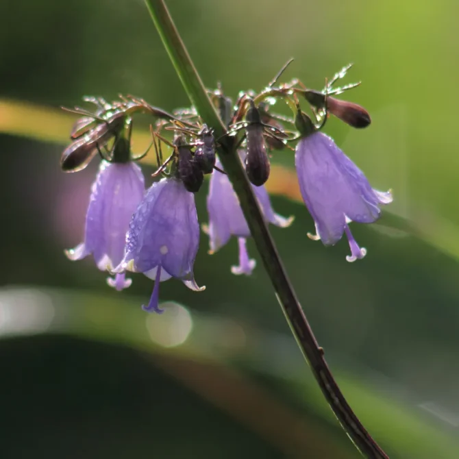 9月になり、秋の七草が咲く季節となりました。淡い紫の小さな鐘のような花を吊り下げるツリガネニンジン(釣鐘人参)もまた、秋の訪れと季節の移ろいを告げてくれる野の花の一つです。華やかでありながらもどこか寂しげな花野で、ツリガネニンジンは風に吹かれて右に左へと揺れ、秋の澄んだ光を受けて、きらきらと輝きます。