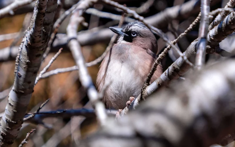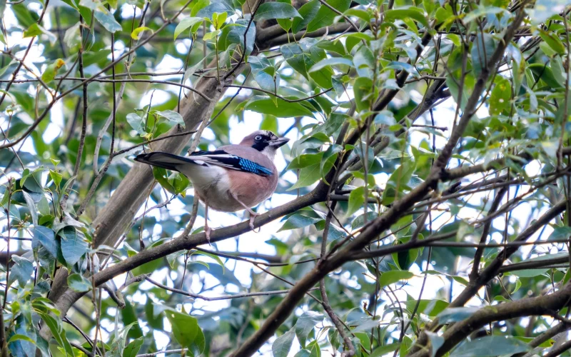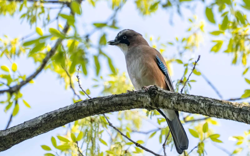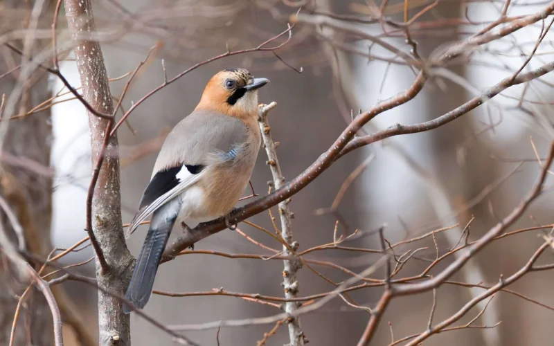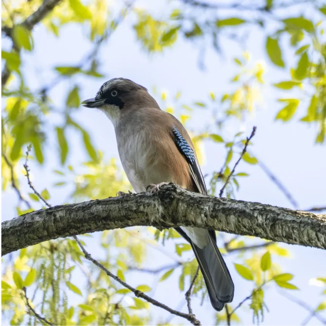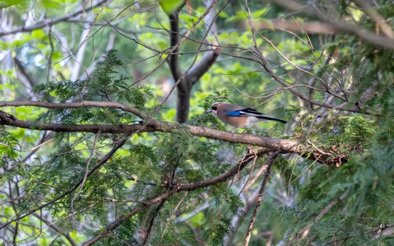 カケスは全長30cmほどの中型の鳥で、カラスの仲間です。日本では屋久島より北の地域なら、どこの森でも姿を見るチャンスがあります。北海道にすむのは、「ミヤマカケス」という亜種で、本州などのカケスとは目や頭の色が異なります。ただ、どちらにも共通しているのが、翼にあるコバルトブルーの羽。日光を浴びてキラリと光るその瞬間は、まるで森に舞い降りた青い宝石のようで、ちらっと見えただけでも幸せな気分になります。