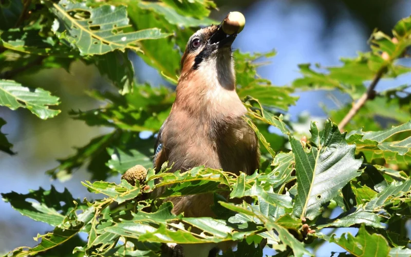秋になると、森にはミズナラやコナラなどの木にたくさんのドングリが実ります。カケスはそれらを冬の食糧として、地中や木の穴など、あちこちにかくして貯える習性があります。しかし、貯えたすべてのドングリを食べるわけではありません。使われずに残ったドングリのいくつかは、やがて芽を出し、木へと成長します。つまりカケスは、自分のために食べものを貯えているつもりが、結果的に森を育てているのです。ドングリの木は将来、またカケスの食べものを実らせますから、彼らは自然の中で持続可能な暮らしを営んでいるともいえます。自然の仕組みというのは、本当によくできているものですね。
