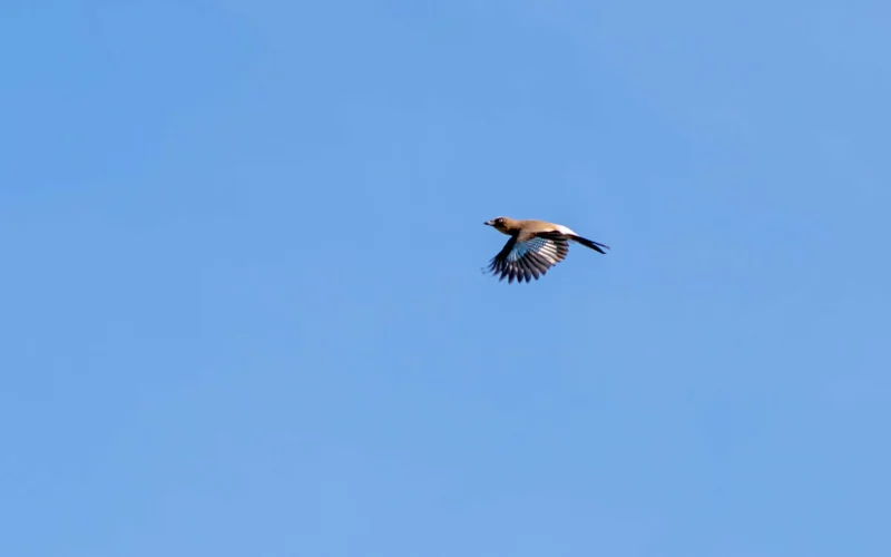 秋の森では、こんなふうにふわふわと飛ぶカケスによく出会います。彼らは冬のすみかへ移動する途中で、夏を過ごした山の森からやって来たのです。このまま平地の森にとどまる個体もいれば、さらに遠くへ旅を続けるものもいます。