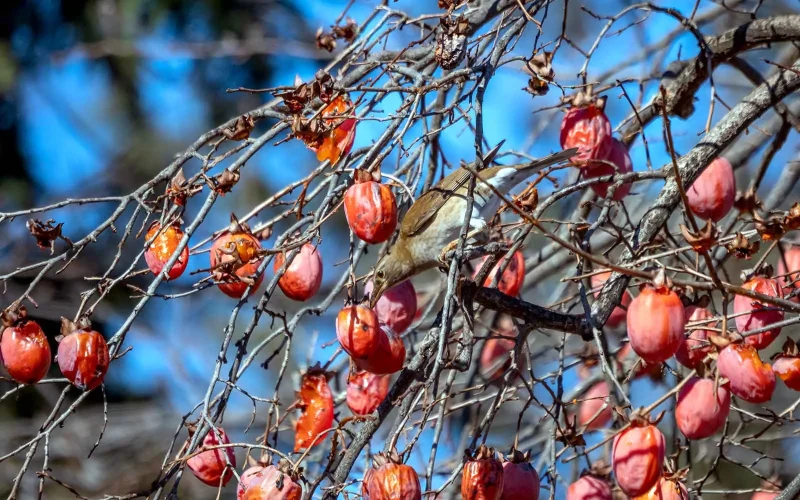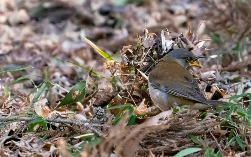 その理由はどうやら食べものの変化にあるようです。日本に渡ってきたばかりのころ、シロハラはカキやクスノキなどの果実を好んで食べます。ところが秋の実りはどの鳥にも人気で、あっというまに食べ尽くされてしまう。するとシロハラは、果実中心の食事から昆虫やミミズなどの地上の生きものへとシフトし、落ち葉の積もる森の地面に降りて採食をはじめるのです。