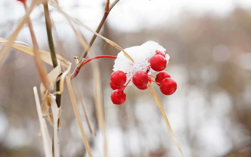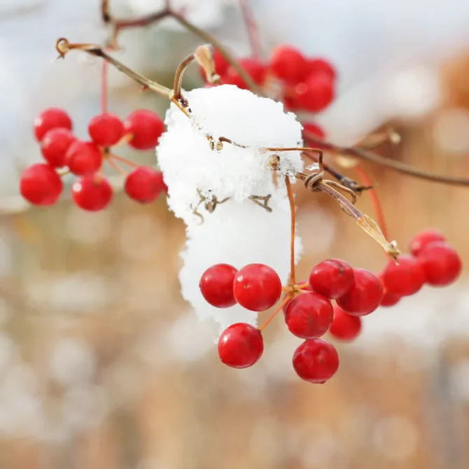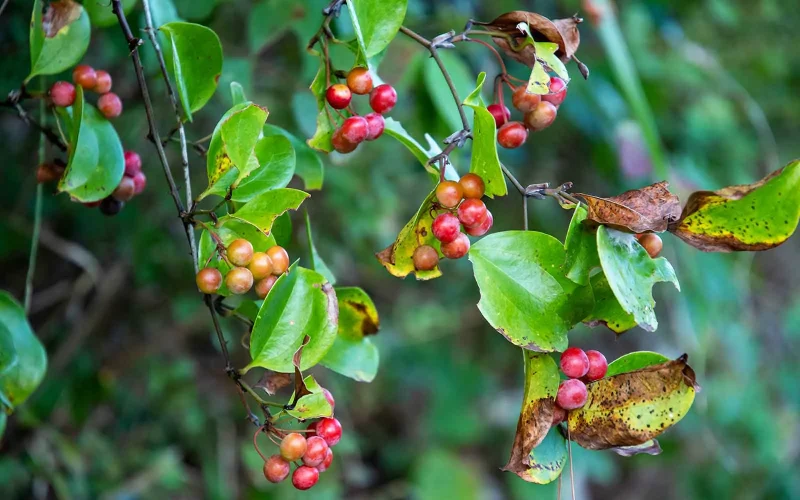 受粉した雌花は花後、直径1㎝ほどの球形の液果をつけ、10~11月になると鮮やかな朱赤色に熟します。果実酒やジャムにも適し、生食も可能。また解毒作用がある“毒消しの実”としても知られ、民間では古くから利用されてきました。