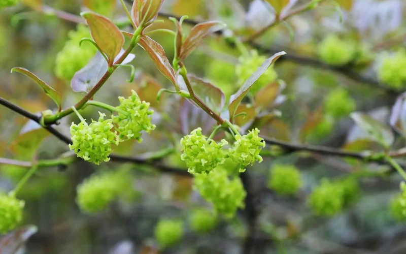 花期は4~7月。葉の付け根から散形花序(さんけいかじょ)を出し、黄緑色の小さな花を球状に多くつけます。散形花序とは、花柄が放射状に広がり、それぞれの先端に一個ずつ花をつける咲き方のこと。花被片は6個、長さ約4mmの長楕円形で、上部はそり返ります。雄花には黄色い葯(やく)が、雌花には先端が三つに裂けた柱頭があります。