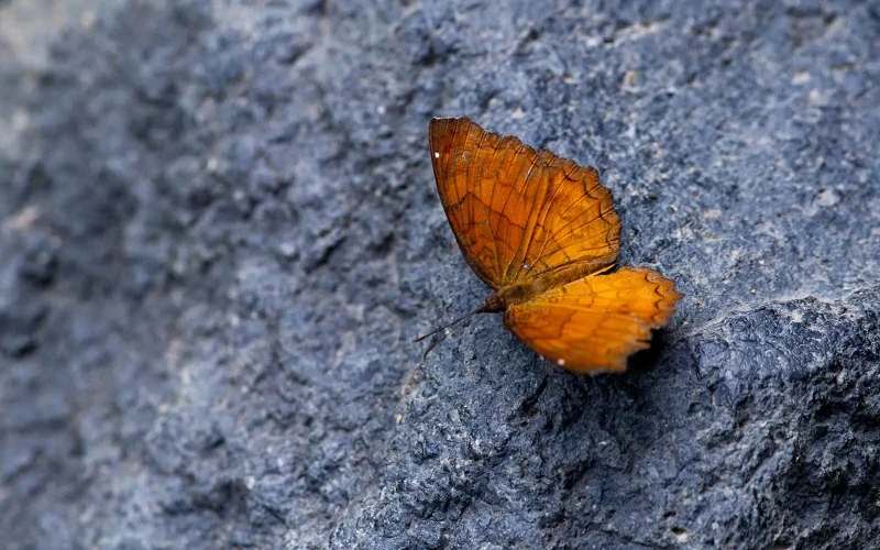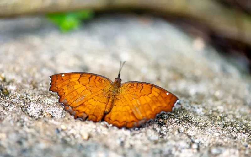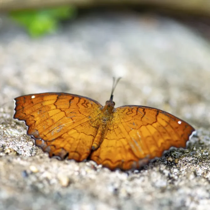 羽を広げたときに見せる模様は大人しい印象ですが、その色味がとても印象的なタテハチョウの仲間です。