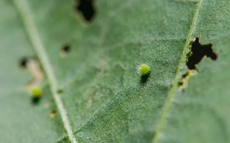 長い毛が生えていて、色は葉っぱに馴染む緑色。