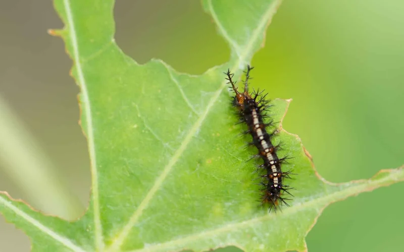 幼虫は黒色でトゲが目立つイモムシです。背中には黄色と白の帯があります。