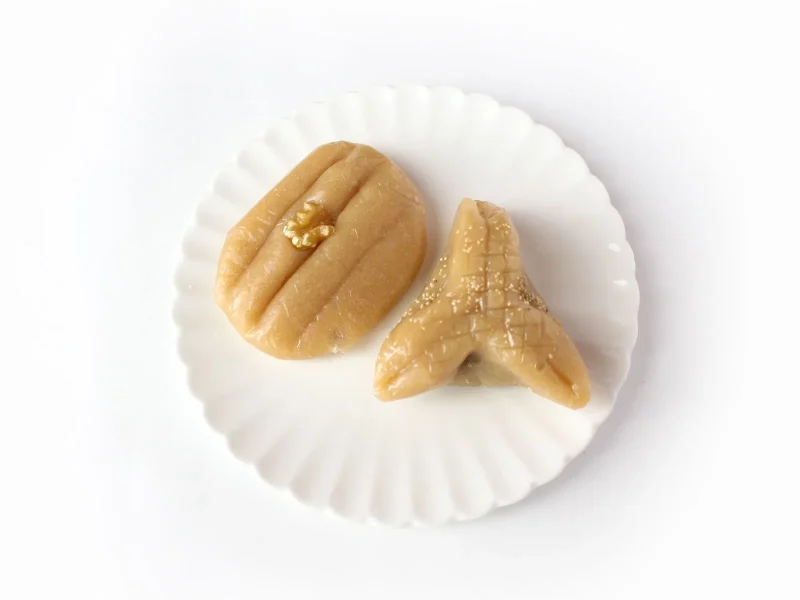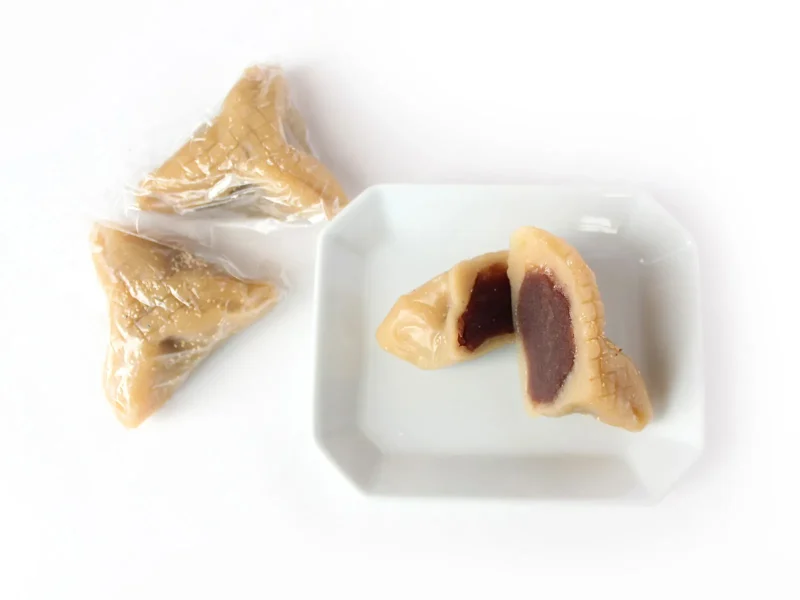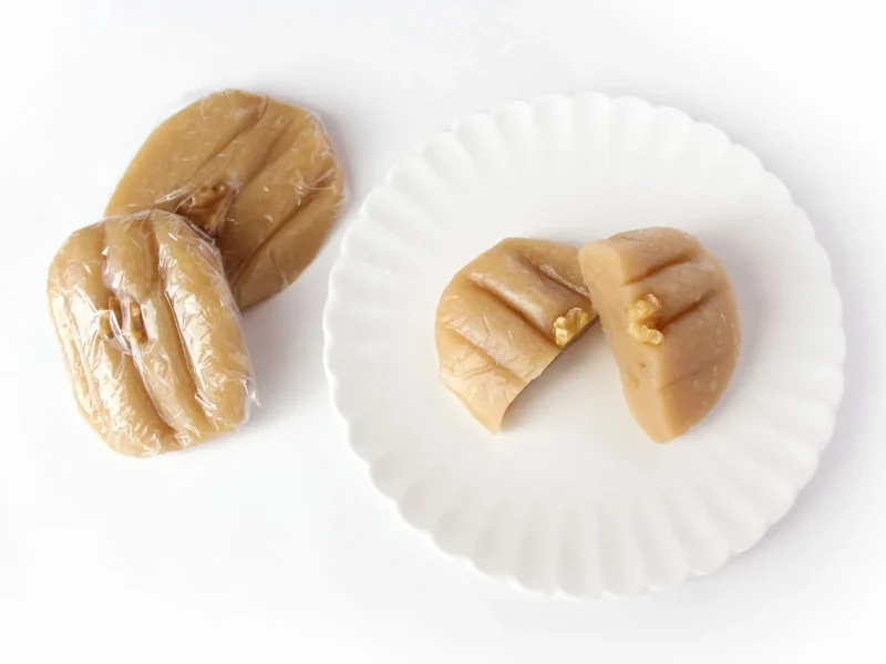 醤油の香る餅生地でできているゆべし。あんこ入りのものは三方向から生地をつまんで包まれた、三角形の形。あんこなしは小判形。一方、くるみゆべしはたっぷりのくるみが入ったゆべしの生地を四角に切り分けたもの。もちもちとした食感が大好きな私は、初めて口にした瞬間、すぐに虜になってしまいました。