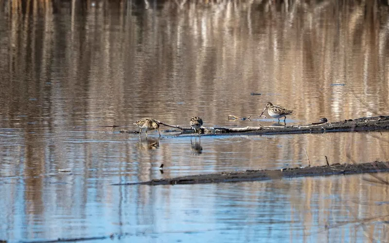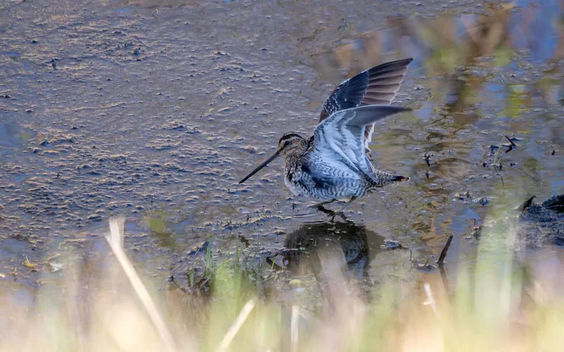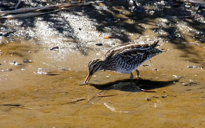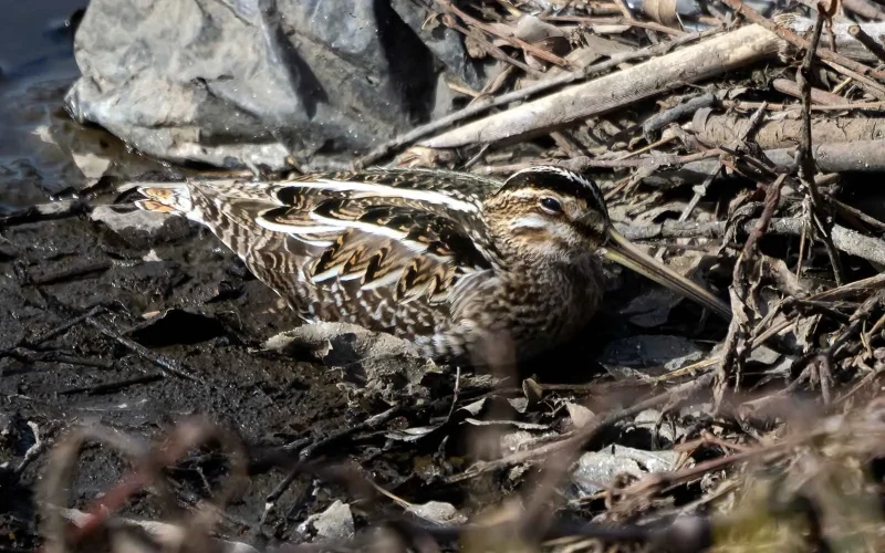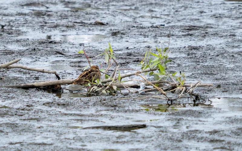 もう一つ、タシギを見ていて感心してしまうのが、その「隠れる力」です。写真を見てもらえれば一目瞭然ですが、体の色や模様が枯れ草とそっくりで、これが抜群のカモフラージュ効果を発揮します。じっと動かずにいられると、本当に「どこにいるの?」という状態になります。
