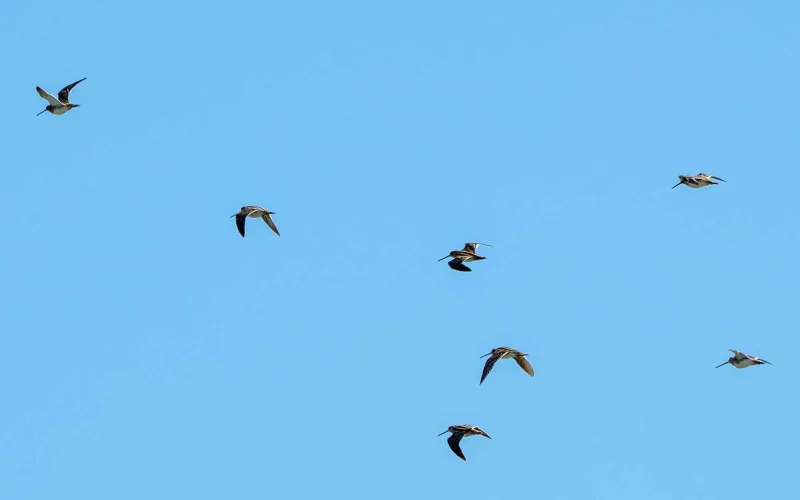 もっとも最近はカメラの性能がずいぶんと良くなりました。そのおかげで、私の場合はスナイパーの腕前がなくても、運と連写に助けられて、飛んでいるタシギの写真が撮れるようになっています。時代の進歩には、つくづく感謝するばかりです。