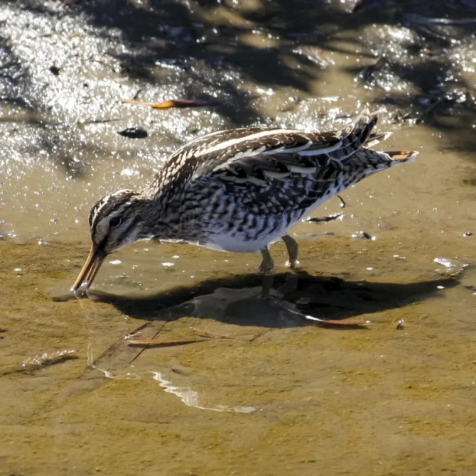 タシギは全長27cmのシギ科の鳥です。ユーラシア大陸の広い範囲に分布しており、北海道では旅鳥として、そのほかの地域では冬鳥として見ることができます。水田で観察されることが多いことから「タシギ」という名がつきましたが、実際には川や沼などの湿地でも出会うことができる鳥です。