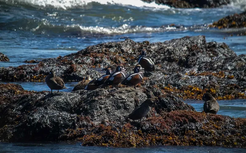 カモと聞くと、湖や池などの淡水にすむ鳥というイメージを持つ人が多いのではないでしょうか。ところが、カモの仲間には、主な生活の場所を海に求める種類もいて、そうした鳥たちは「海ガモ」と呼ばれます。シノリガモは、そんな海ガモのひとつで、世界的には太平洋北部の沿岸とアメリカ東海岸に分布しています。日本では、主に北日本の海岸に冬鳥として渡来し、とくに北海道や東北の岩礁が発達したいわゆる“磯”の海岸でよく見られます。磯には、シノリガモの主な食べものであるカニや海藻がいるので、それを狙って棲み着いているというわけです。また、北海道と東北の渓流では、少数が繁殖していることも知られています。