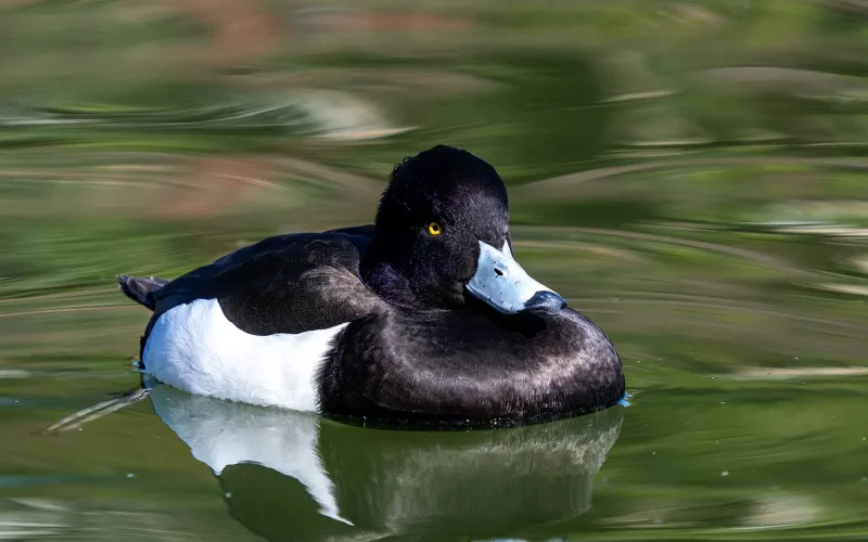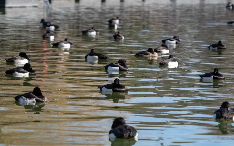 キンクロハジロは、全長40cmの中型のカモ類です。ただし、この数値は首を伸ばした状態で嘴の先から尾羽の先までを計測したもの。実際には首を縮めていることが多く、見た目はずっと小さく感じられます。公園の池で普通に見られますが、湖や沼、川、内湾など、水辺であればかなり幅広く姿を現す、なかなかの適応力の持ち主です。