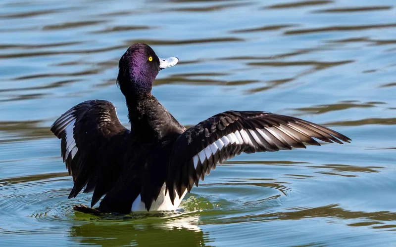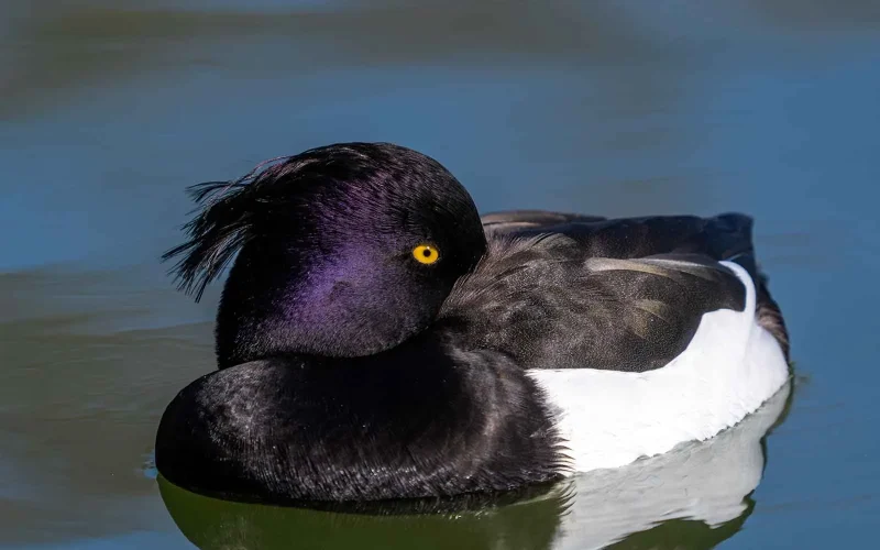 キンクロハジロの特徴で、忘れてはならないのが頭にある冠羽(かんう)と呼ばれる飾り羽です。冠羽は雌雄ともにありますが、オスのほうが羽毛が長い傾向があります。私はこの冠羽を見るたびに、どうしても寝ぐせのついた髪の毛を連想してしまい、思わず笑みがこぼれます。春一番の強い風で揺れる様子は、なかなか見ていて楽しいものです。ちなみに我が家では、朝の寝ぐせを「キンクロハジロになっているよ」と表現するのですが、鳥仲間に聞いてみると、似たような呼び方をしている家が多いようです。どうやらこれは、バードウォッチャー界隈の静かな共通語みたいです。