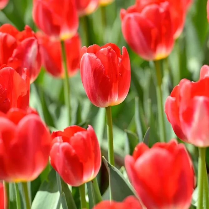 ユリ科チューリップ属の球根植物の総称。地中海沿岸から中央アジアにかけて約150種が分布。園芸品種は現在、世界中で4000 種以上。開花期は3~5月。草丈は品種によって異なり、10~70㎝。葉の中心部から花茎を1本伸ばし、カップ状の花を一つ咲かせる。