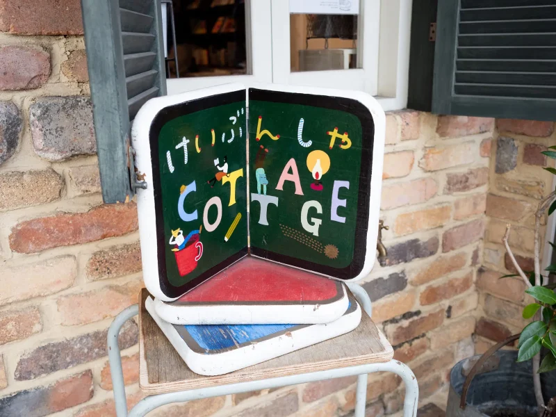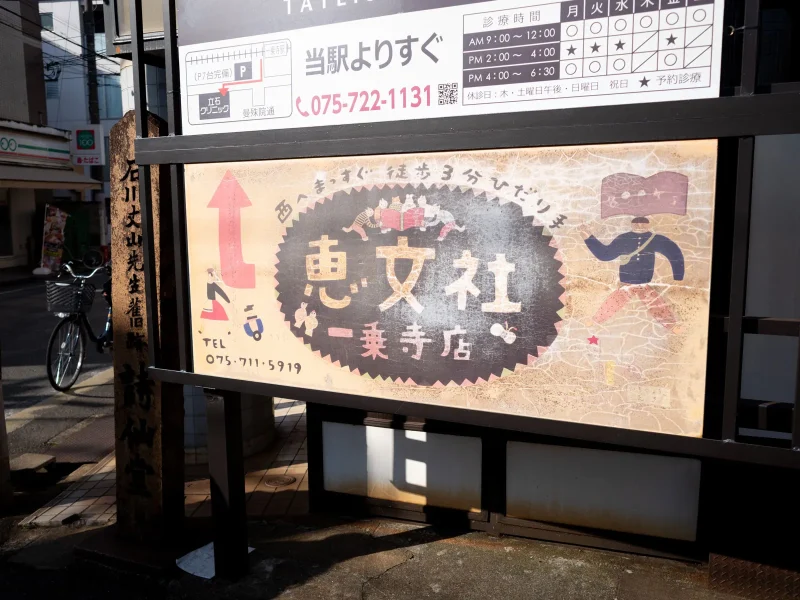 恵文社は出町柳駅から3つ目の一乗寺駅を降ります。満員電車から抜け出してほっと一息つきながら改札を出ると、いつから設置されているのか、年季が入ってなかなか味わいのある看板がお店の方向を教えてくれました。