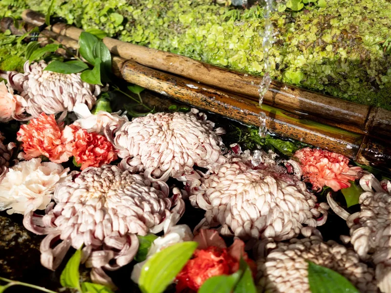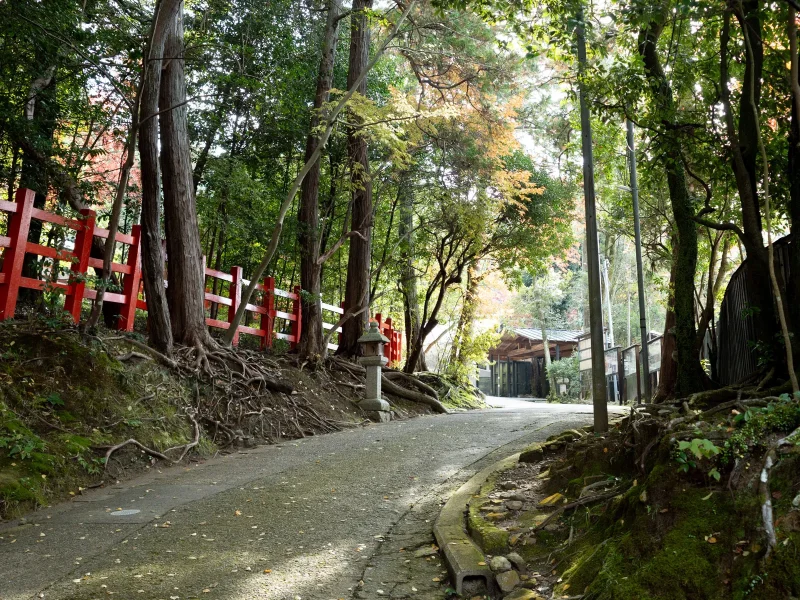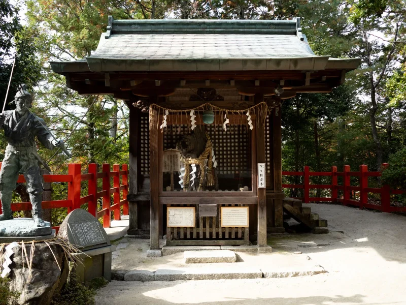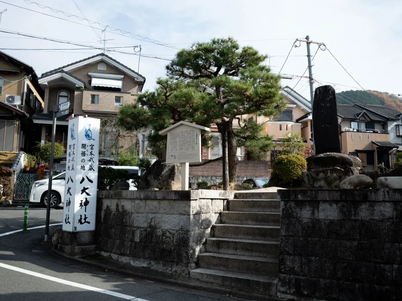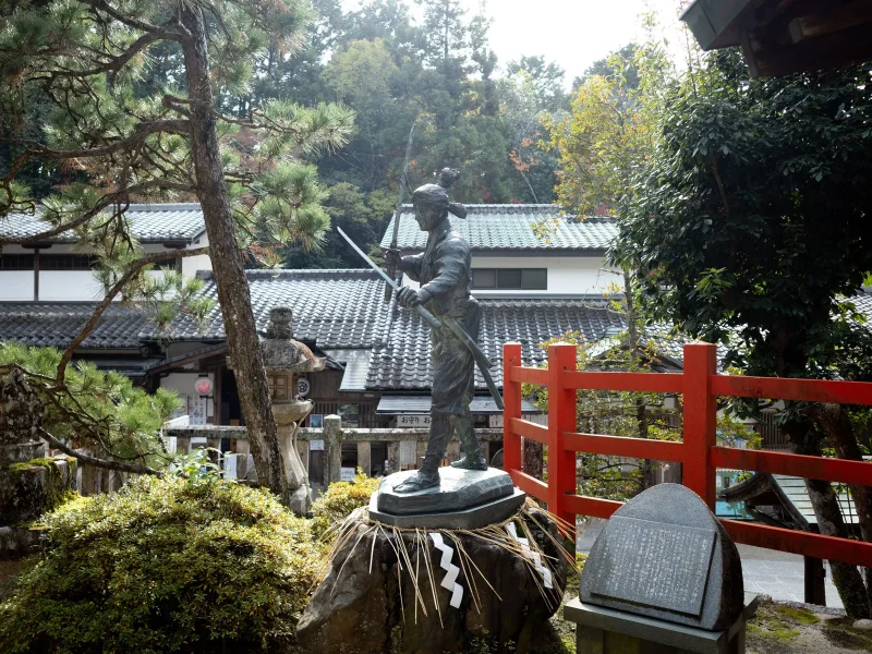 もう少し坂を登った先には、武蔵が決闘前に訪れたと言われている八大神社があります。どうせならそこまで足を伸ばして、武蔵が見たであろう景色をこの目で見てみることに。生きるか死ぬかの大きな決闘を前に、どのような心境だったのだろうと想像を膨らませながら、境内へと続く緩やかな坂道をゆっくりと上りました。八大神社には、代名詞である二刀を構える宮本武蔵像と、決闘当時に植っていた松の木の一部が祀られていました。でこぼことした松の古木には歴史の重みが感じられ、じつに感慨深いものでした。宮本武蔵が好きな方、歴史が好きな方、『バガボンド』ファンにはおすすめのスポットです。