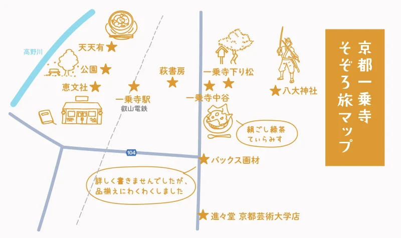 そのあともいろいろと一乗寺近辺を歩きましたが、これ以上はちょっと長くなりそうなので詳しくは割愛します。優しい店主のいる古本屋「萩書房」さん、心躍る品揃えの「バックス画材」店さん、芸術大学横のパン屋さん「進々堂」さんなど、素敵な場所がたくさんある町でした。またぜひ歩きたいなあ。