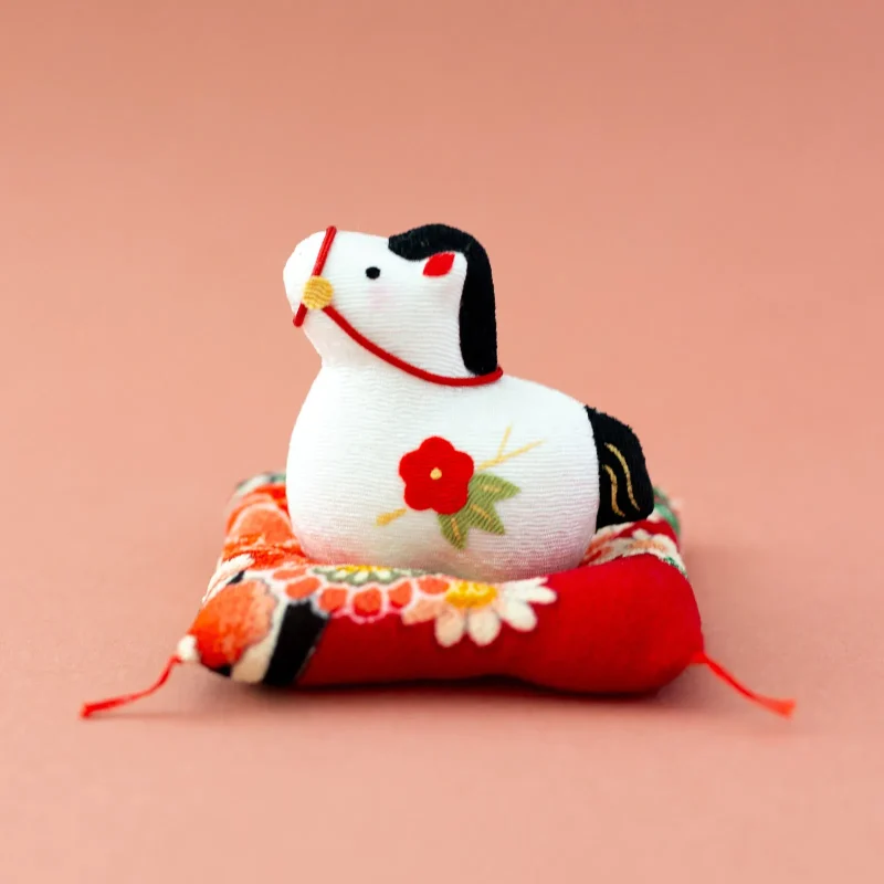 かわいらしい 手のひらサイズの福午です。その年の干支を飾ると、家内安全祈願など縁起が良いとされます。ふかふかの座布団にお行儀よく座っています。素朴でかわいらしい馬の表情とほんのり染まった頬に癒されますね。