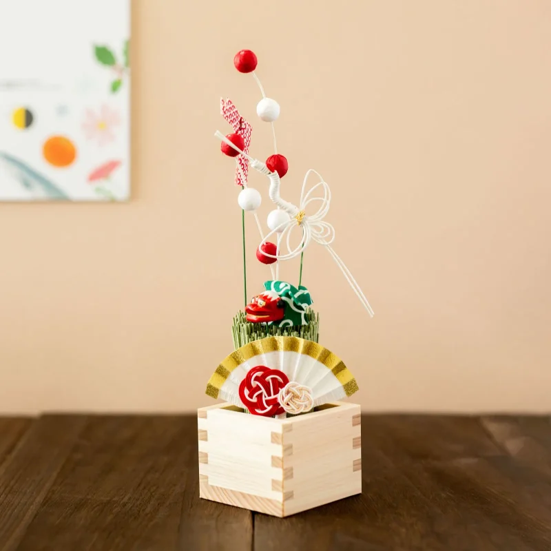 新年をお祝いする、福を招く小さな舞台。小さな五勺枡におめでたい獅子舞モチーフをあしらった、福を集めた愛らしいお正月飾りです。ますます福が入る「枡」、長寿の象徴「鶴」、てぬぐいに見立てた「福(拭く)結び」など、縁起物に一年の福への想いを込めながら、お飾りください。
