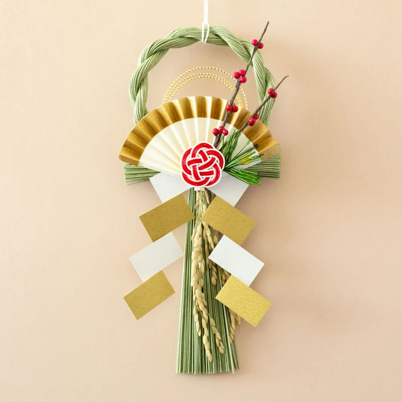梅結びの水引がアクセントになった稲わらを模した紙製のお飾りです。古くから稲には神が宿るとされ、稲わらのお飾りには一年の幸福と豊穣を祈る心が込められています。