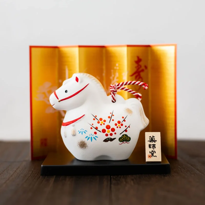 2026年の干支「午」の土鈴と台座、金屏風がセットになった縁起物。馬は、力強く前進する姿から「物事がうまくいく」、そして馬の疾走する姿から「幸運が駆け込んでくる」といわれ、古くから縁起が良いとされています。インテリアとして飾るだけでなく、大切な方への新年の贈り物にもぴったりです。