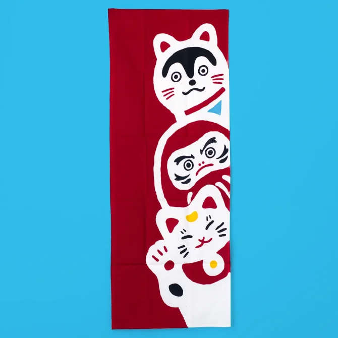 招き猫、達磨、犬張り子が描かれた、縁起物づくしの手ぬぐい。真っ赤な縁起の良い手ぬぐいを飾れば、にぎやかで楽しいお正月を迎えられそうですね。