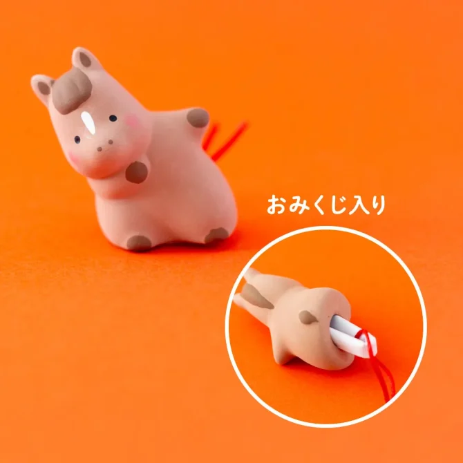 陶器でできた小さなうまの置物に、おみくじが入っています。おみくじを取り出したあとは、「のぞきうま」として飾ってお楽しみください。