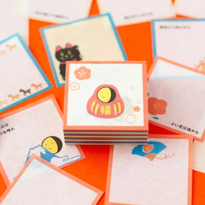 昔ながらの日めくりカレンダーの紙のメモ。 だるまや招き猫、内手の小槌、富士山、亀など縁起のいいものがたくさん登場します。