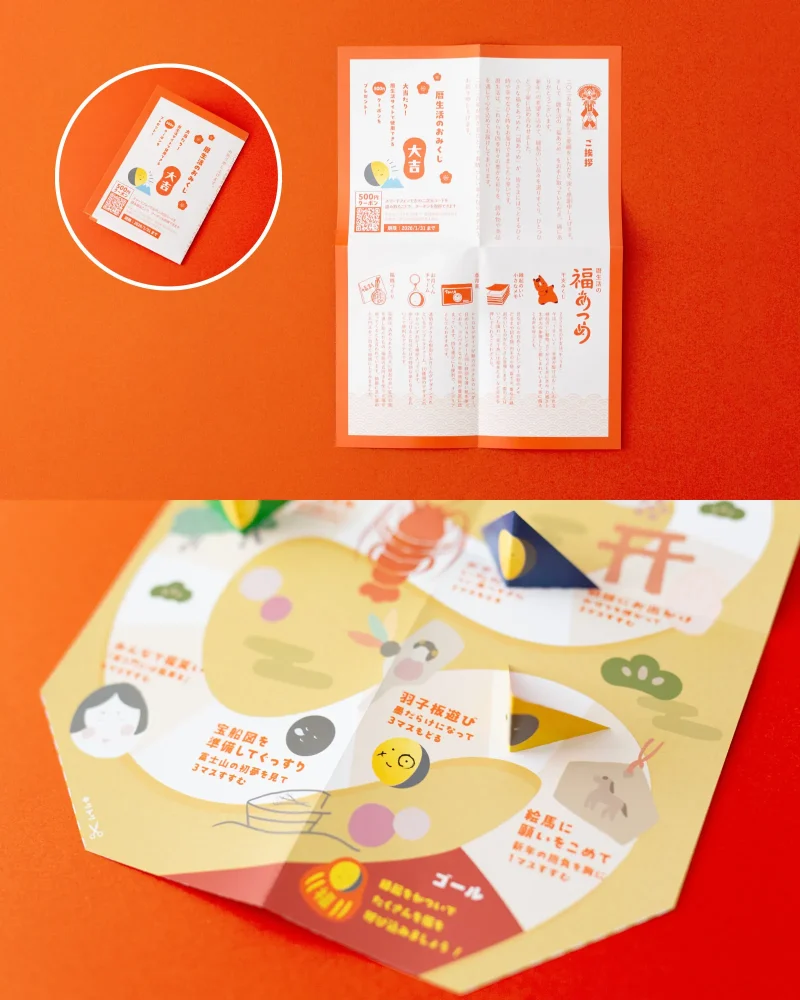 「暦生活の福あつめ」をご購入いただいた方だけに、暦生活でご利用いただける500円OFFクーポンをプレゼント。裏面は、暦生活のお正月を楽しむ「福笑すごろく」になっています。お手持ちのサイコロを振って、福を集めて楽しんでください。