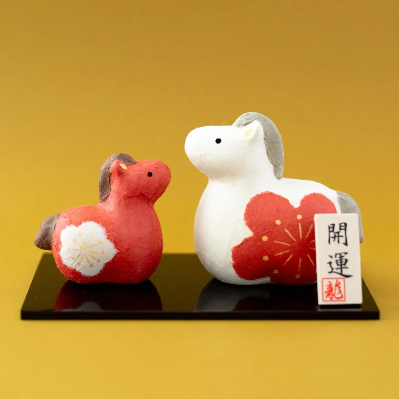 一枚一枚丁寧に手作業で和紙を貼った、おめでたい紅白の親子馬の干支飾りです。その年の干支を飾ると、家内安全祈願など縁起が良いとされます。和紙ならではの独特の風合いと手作業で作られた味わいのあるお飾りです。
