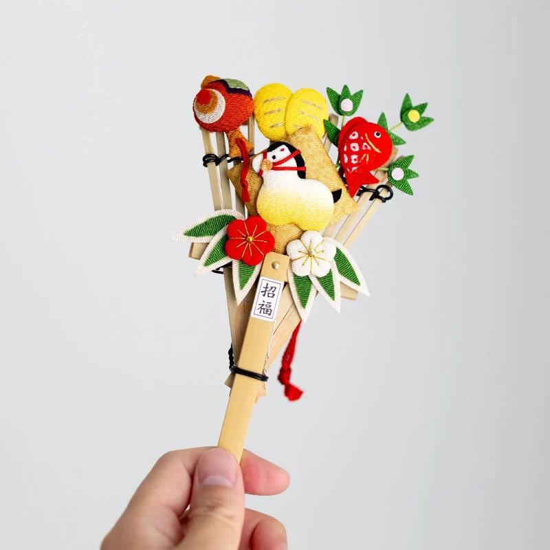 手のひらサイズの熊手に、ちりめんで作られたたくさんの縁起物をあしらった正月飾りです。 吊りさげられるタイプなので、お部屋に飾って運気を呼び込んでみませんか。くま手は、落ち葉をかき集めることにちなんで、「幸福をたくさん掻き込む」縁起物とされています。