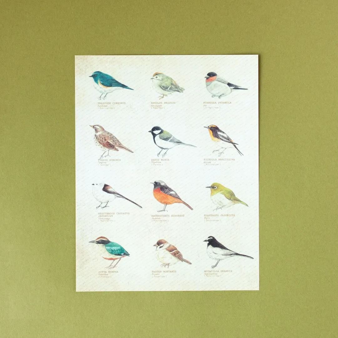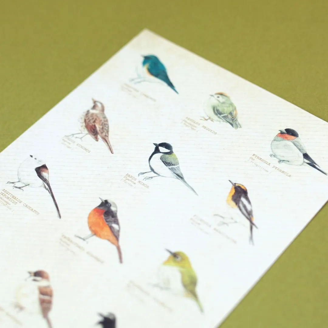 - 12種類の野鳥の絵柄(スズメ、メジロ、ルリビタキ、ウソ、シジュウカラ、ジョウビタキ、キビタキ、シマエナガ、セグロセキレイ、キクイタダキ、ツグミ、ヤイロチョウ)