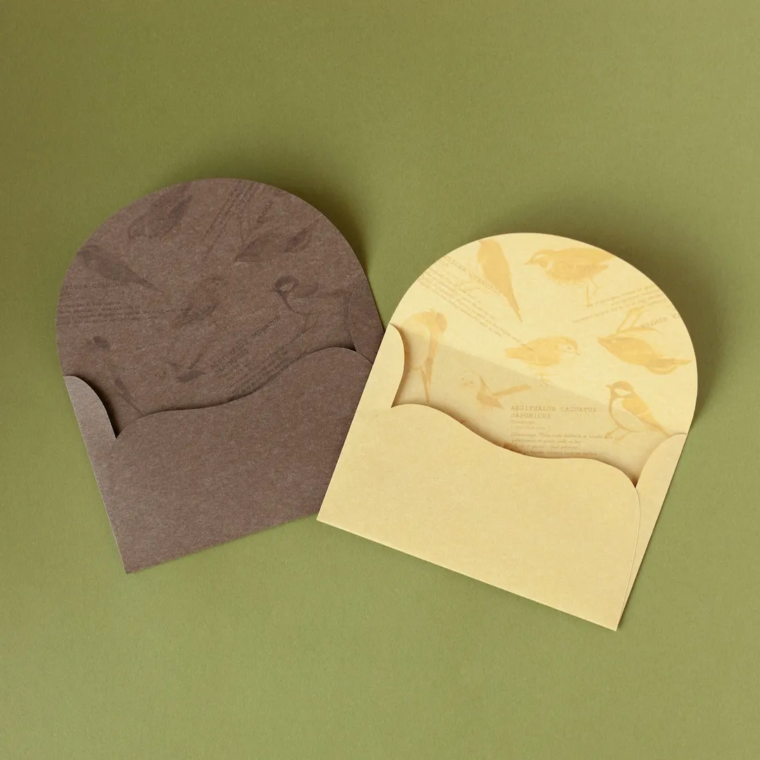 封筒は深みのあるブラウン2枚と、アクセントカラーのマスタード色が1枚入っています。風合いのあるふわっとした優しい手ざわりの紙を使用しています。