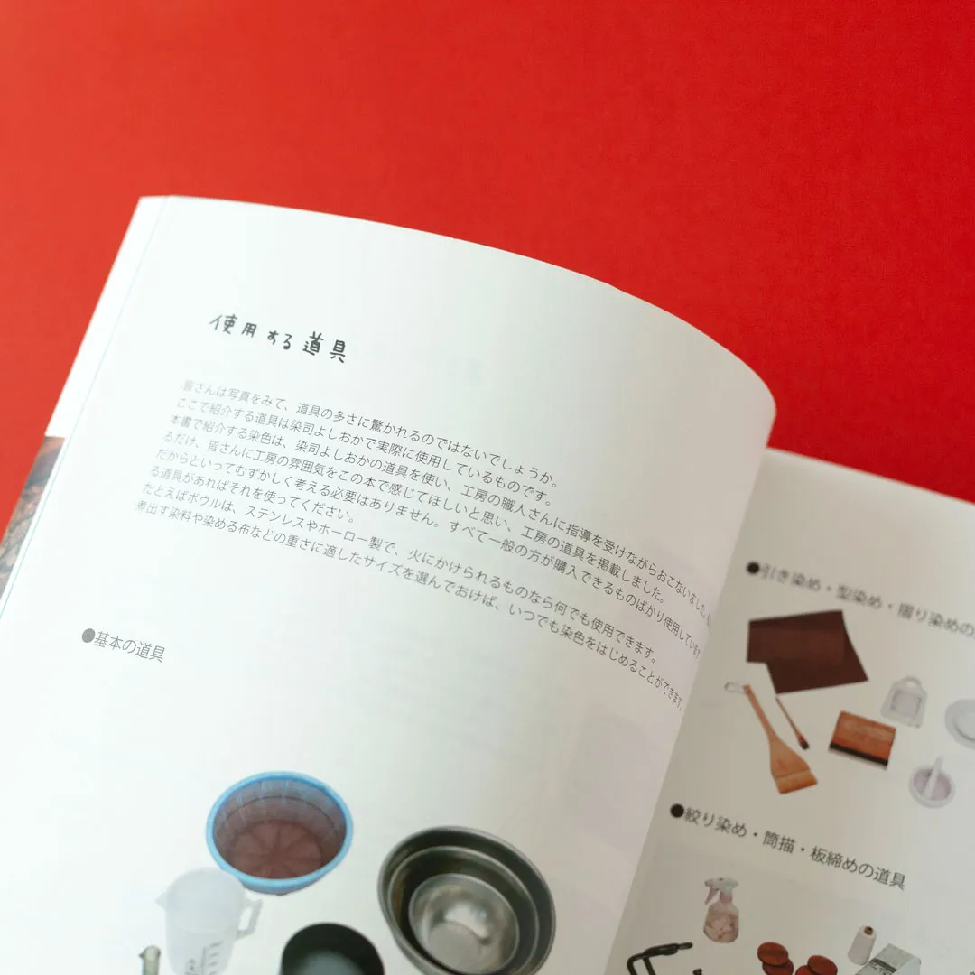 道具や布選び、染めの基本・応用まで、写真とテキストでわかりやすく解説しています。