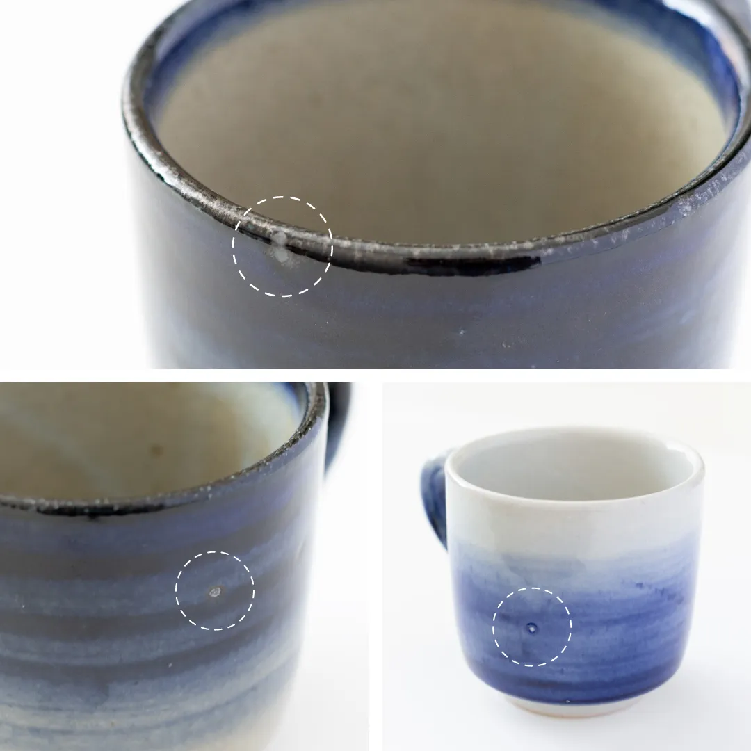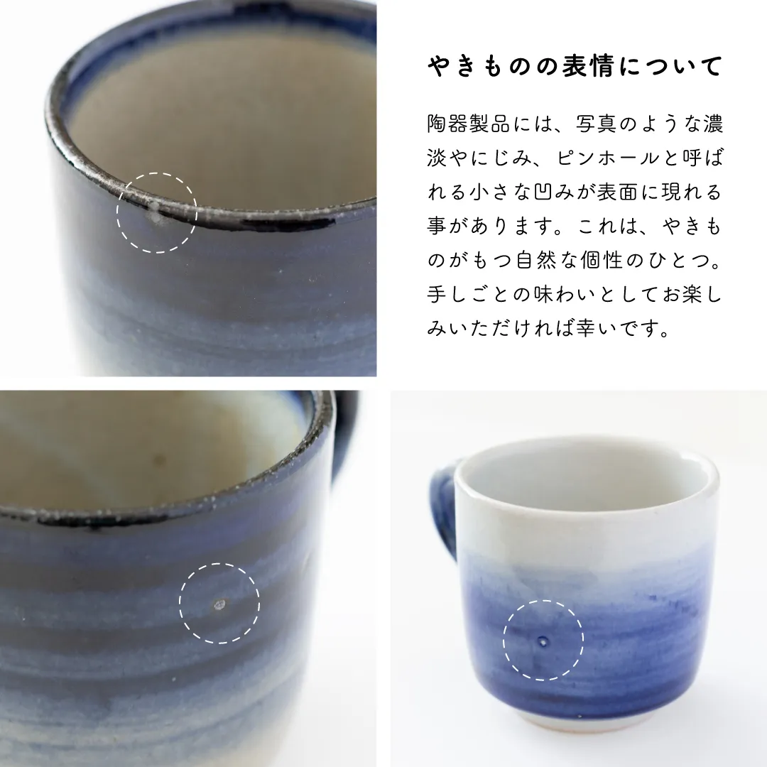 また陶土・釉薬の性質上、釉薬が白っぽく垂れたり、ピンホールと呼ばれる小さな凹みが表面に現れる事があります。