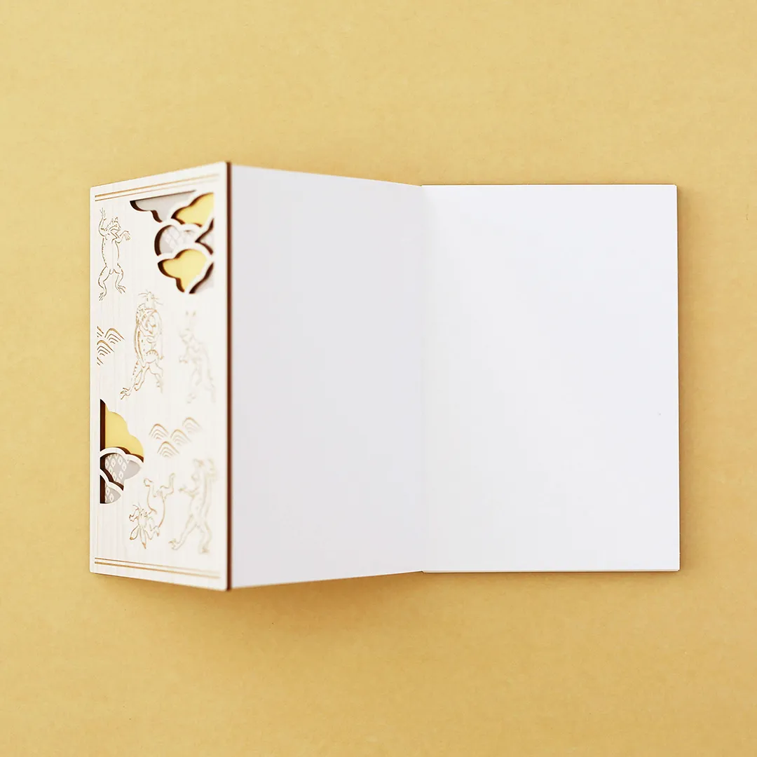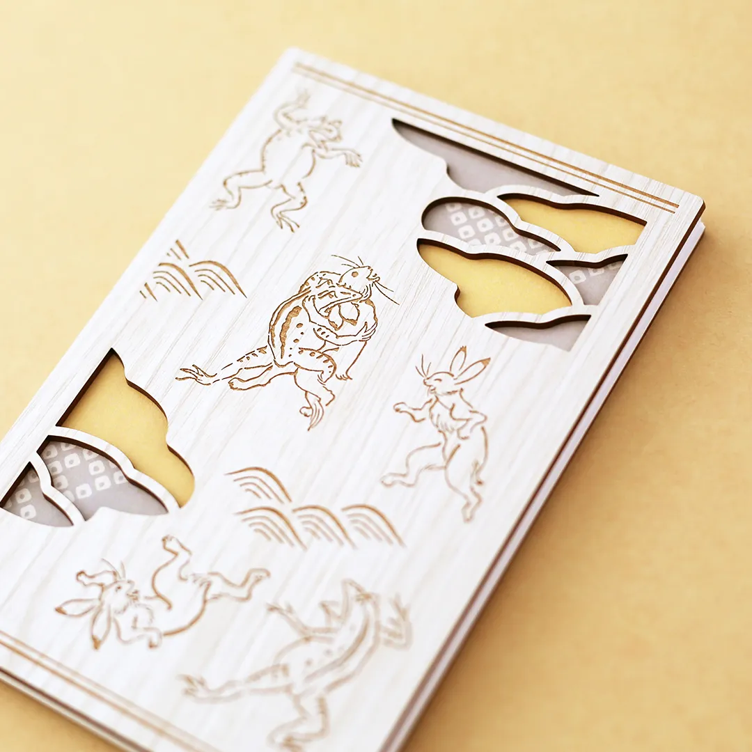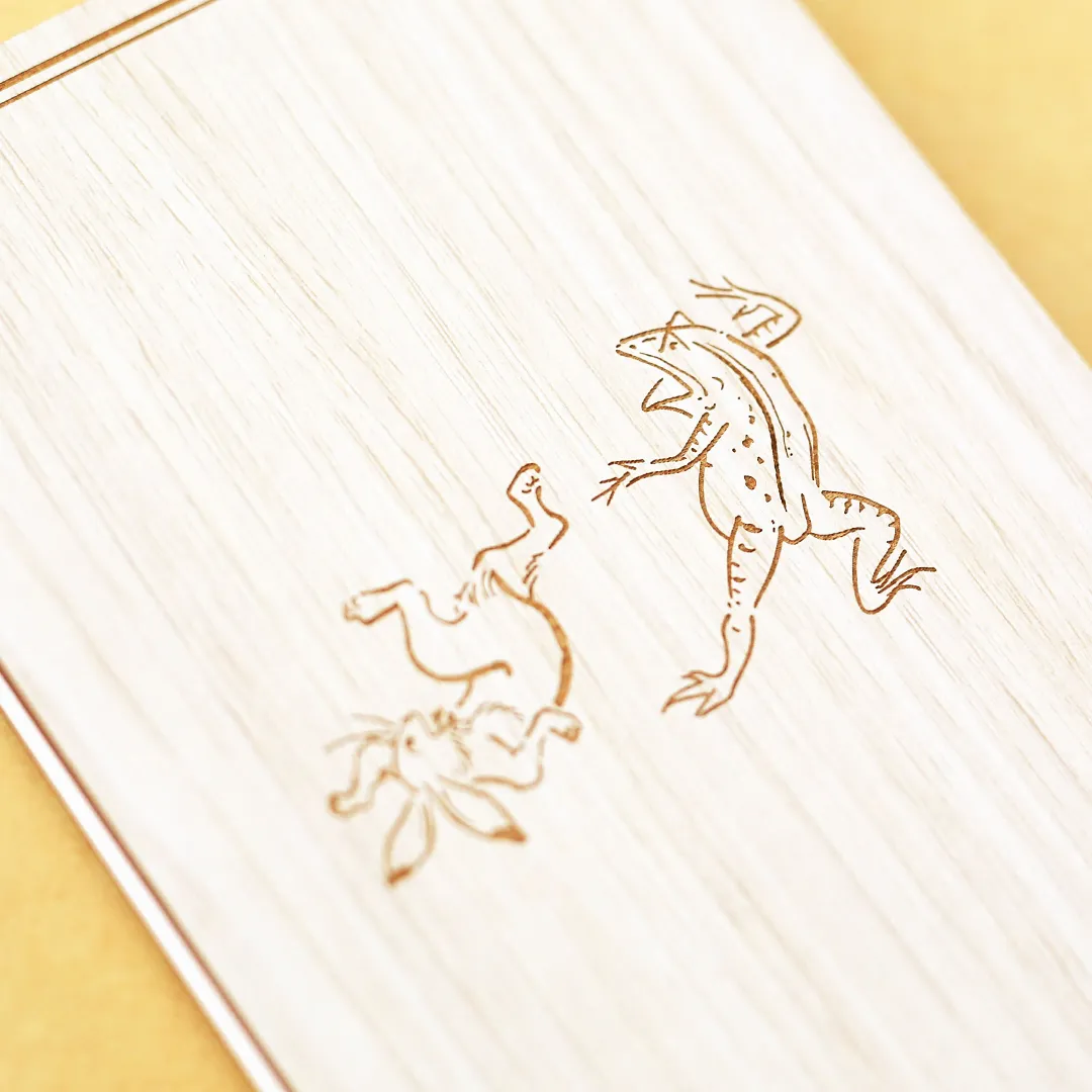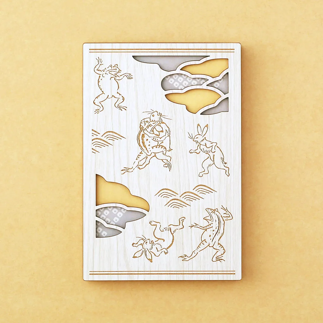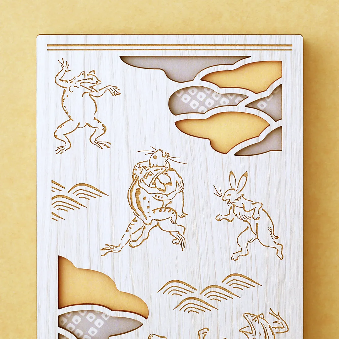 国宝・鳥獣人物戯画の名場面、うさぎとカエルが相撲を取る場面をモチーフにしています。 熱心に応援するカエルや、打ち負かされてしまってひっくり返るうさぎの繊細な線のタッチや雰囲気を、レーザー加工等で再現しました。