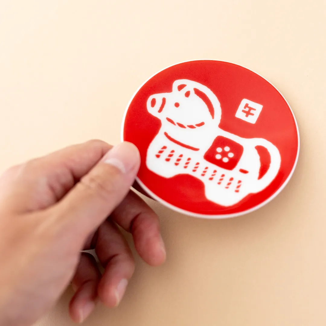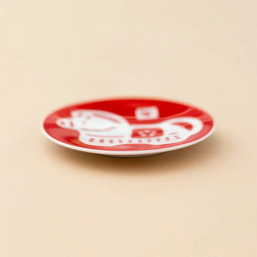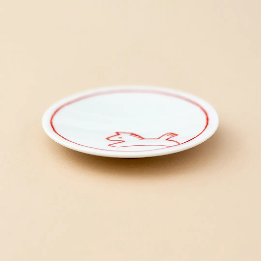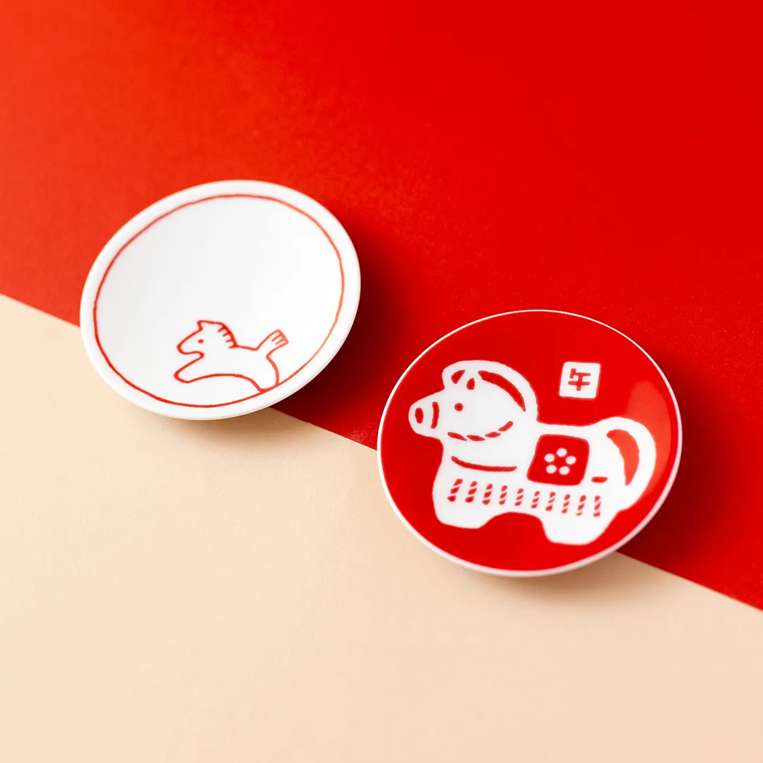 おめでたい紅白で、2026年の干支「午」(うま)を描いた小皿です。