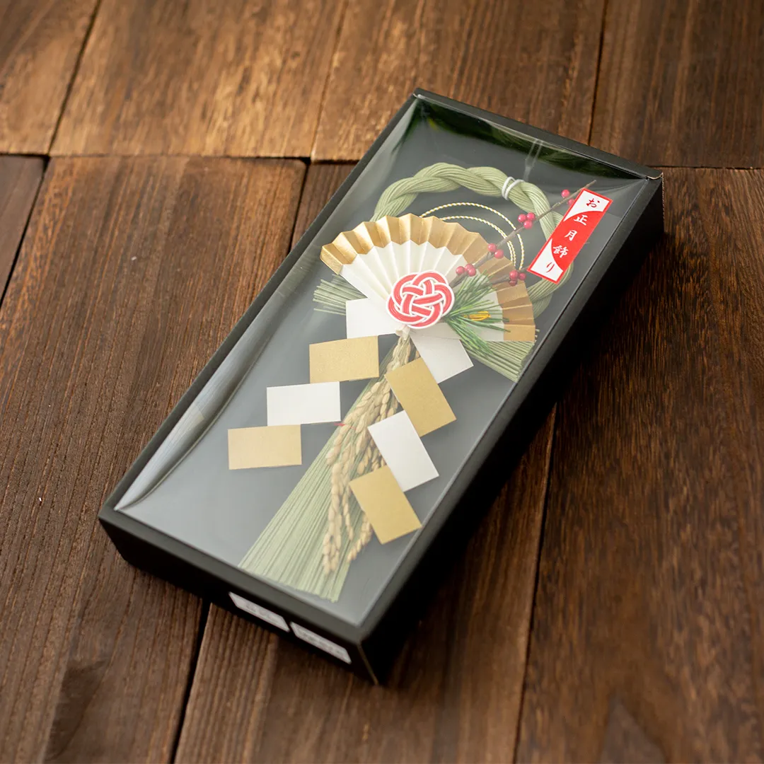 末広とは、お祝いに用いられる扇子のことで、幸せな未来へ向けて道が開けますように、という願いが込められています。 清らかな松と可憐な梅のつぼみを添えて、新しい年の幸せを願う想いを形にしました。