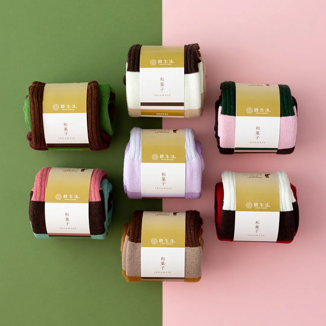 暦生活オリジナル「IROAWASE靴下」から、寒い季節にぴったりな厚手の靴下が新登場。 今回のIROAWASEは、冬に楽しみたい「和菓子の色」をまとった靴下です。