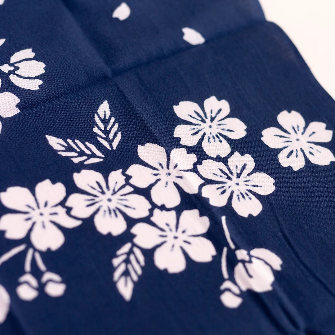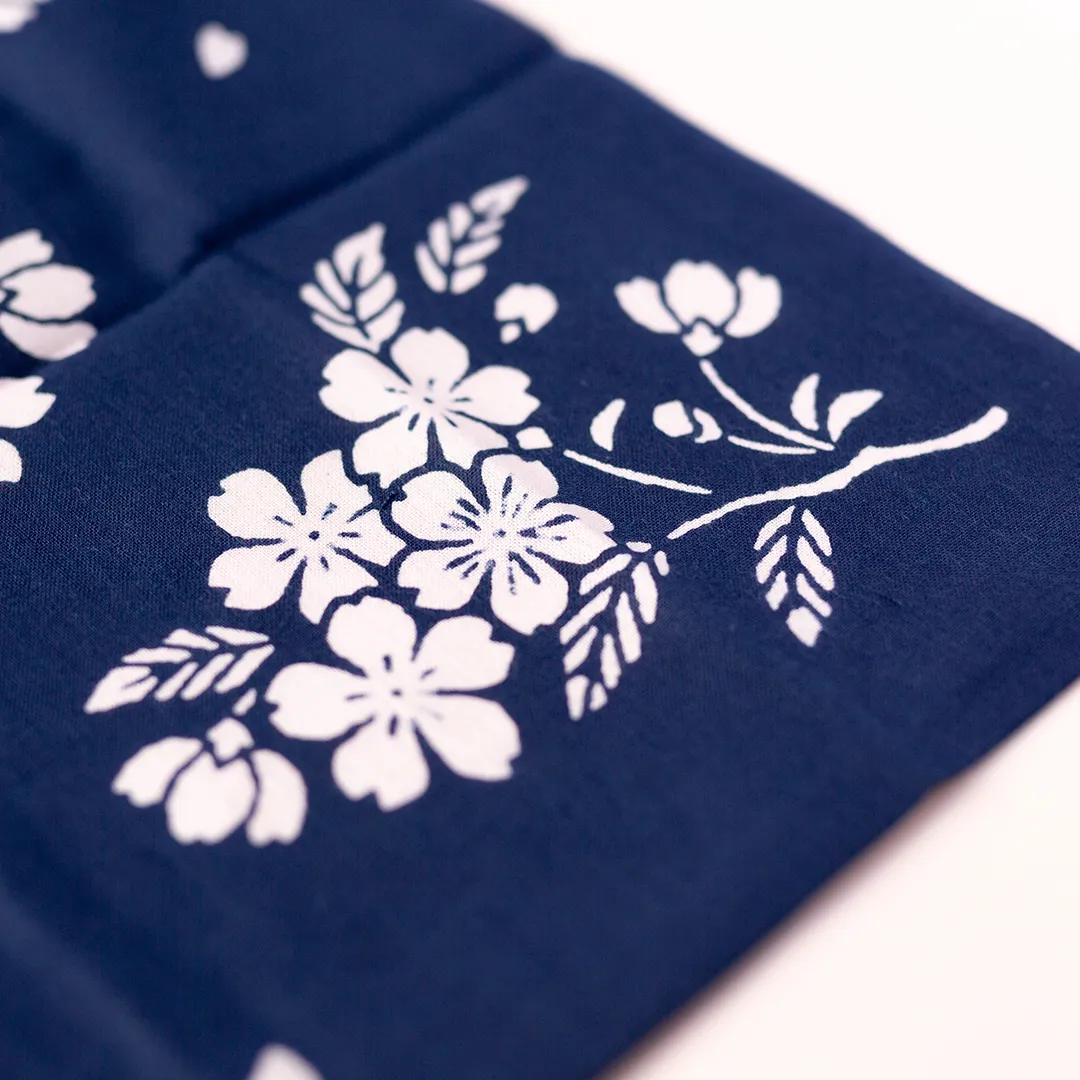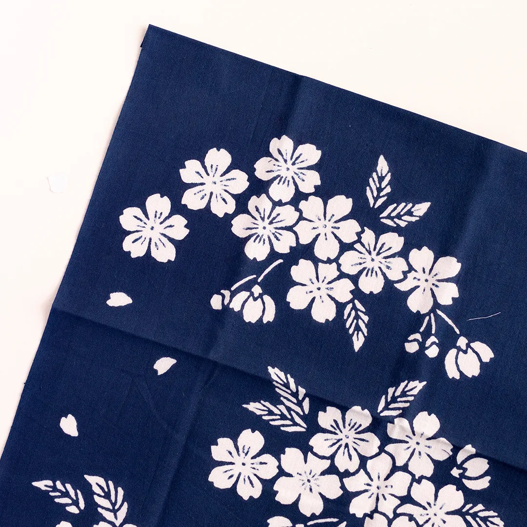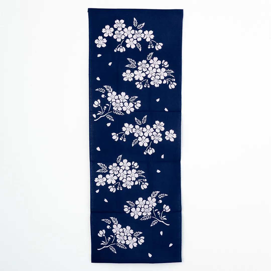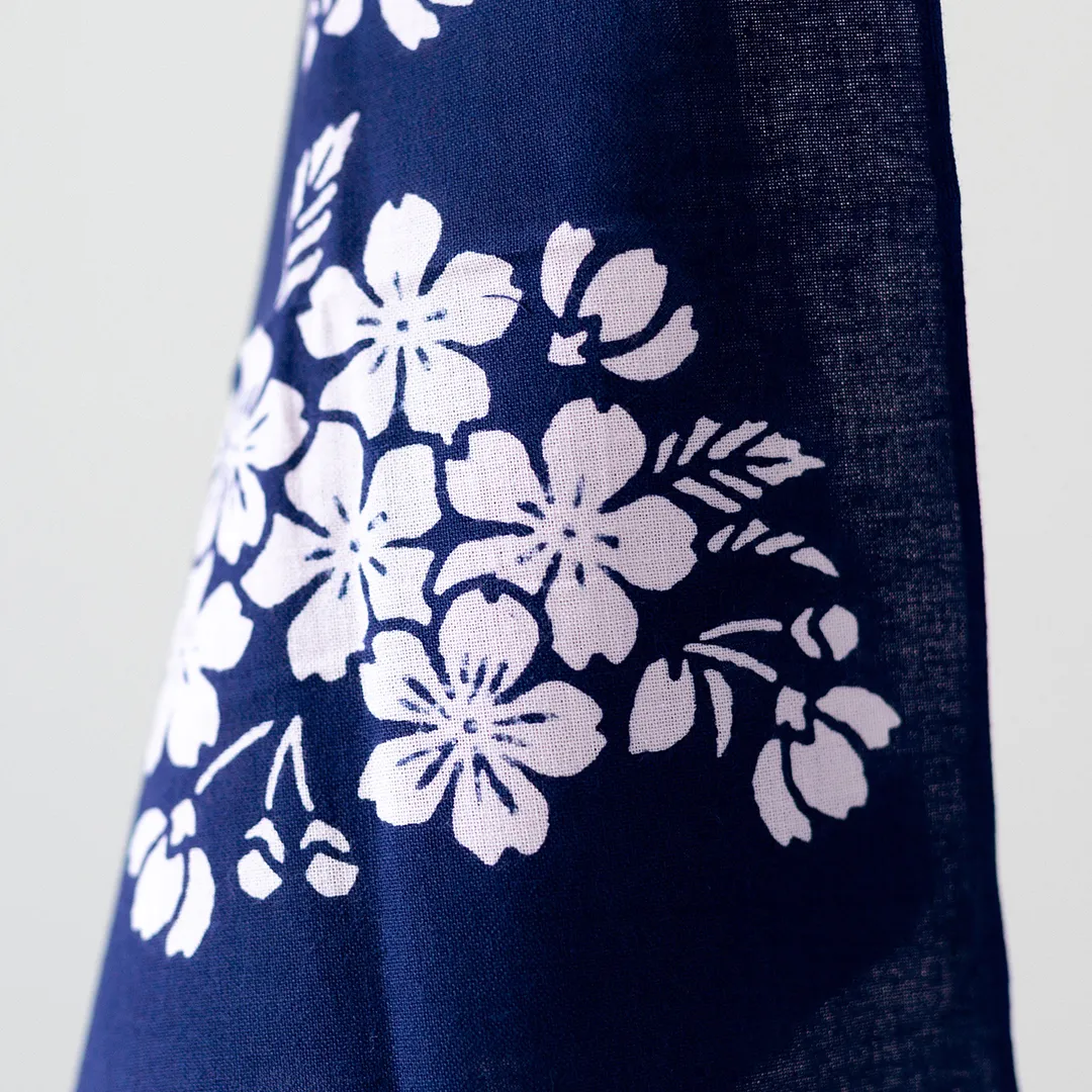 日が落ちて、だんだんと空が深い紺色に染まるころ。夜風に揺れる桜の花の様子を、手ぬぐいの上にそっと映した「宵桜(よいざくら)」。