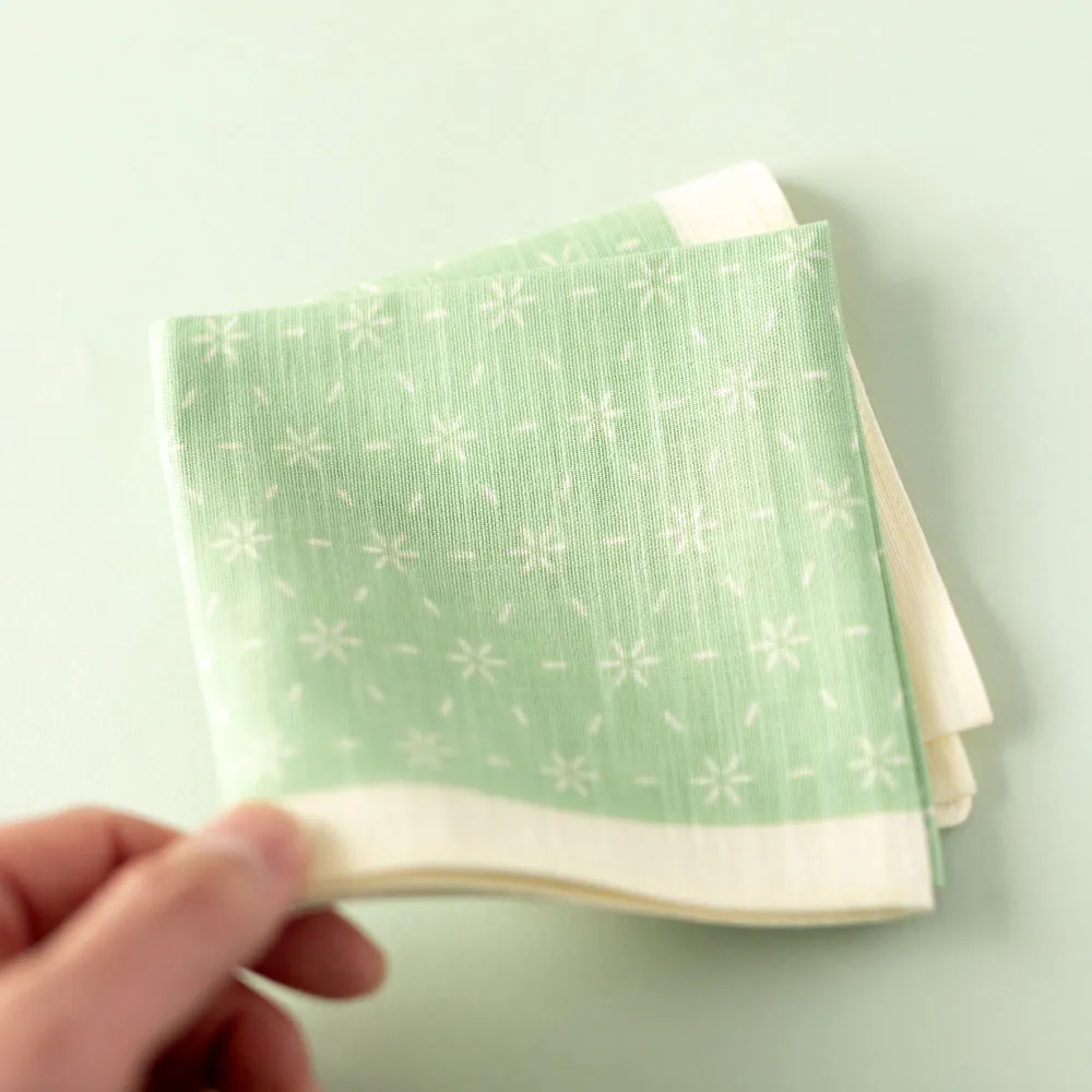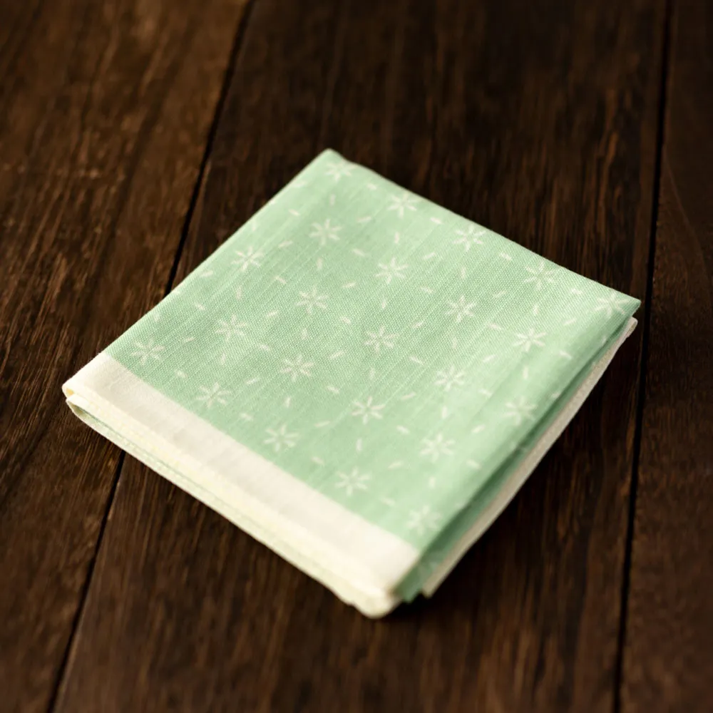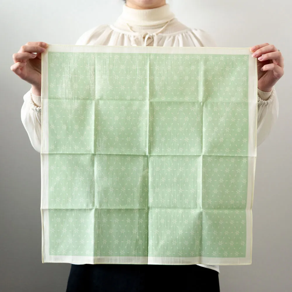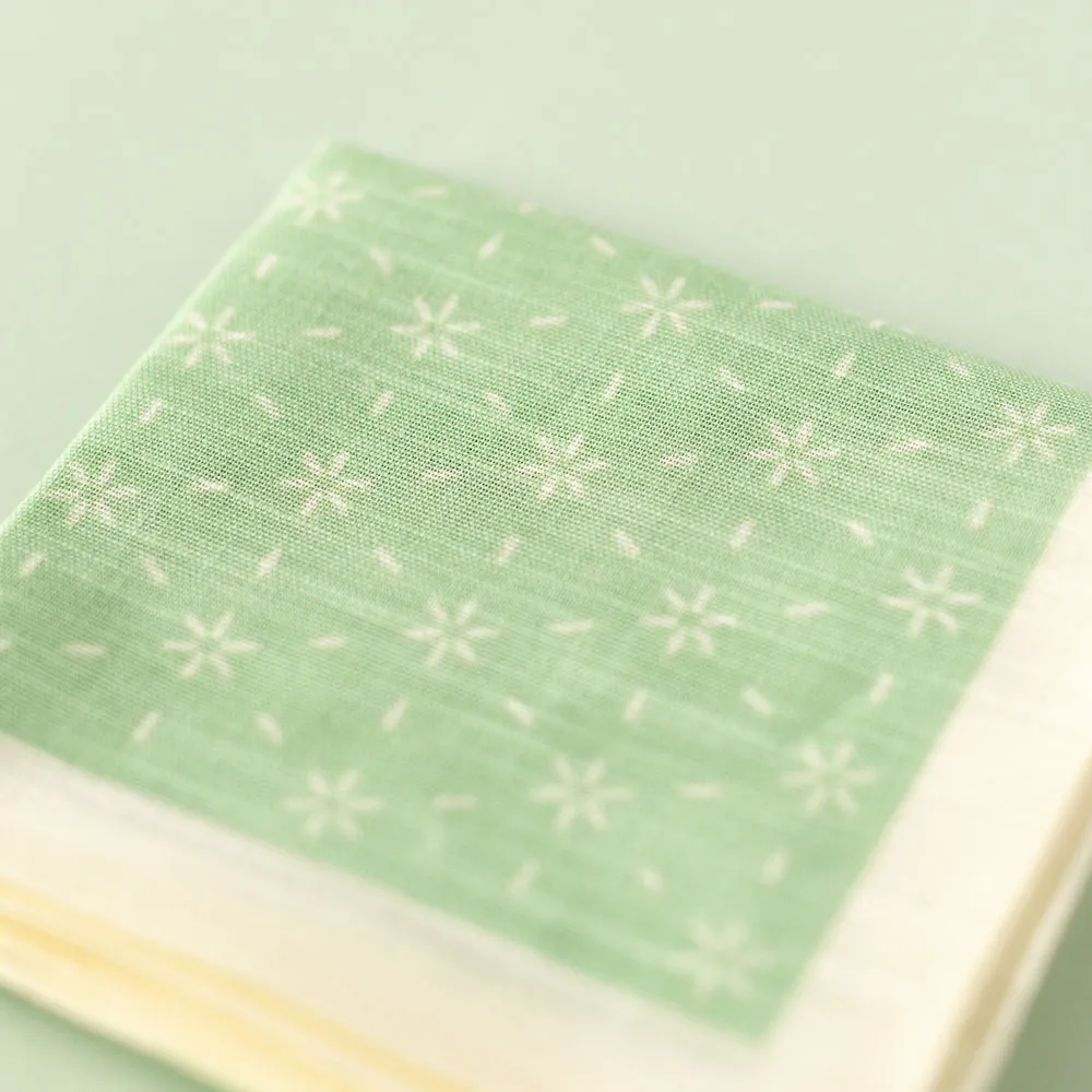 さわやかな若草色にちりばめられた小さな星々が、やさしく連なり合う「ほしつなぎ」のデザインです。星の部分やハンカチの縁は白ではなく、優しい生成り色になっているのもポイント。
