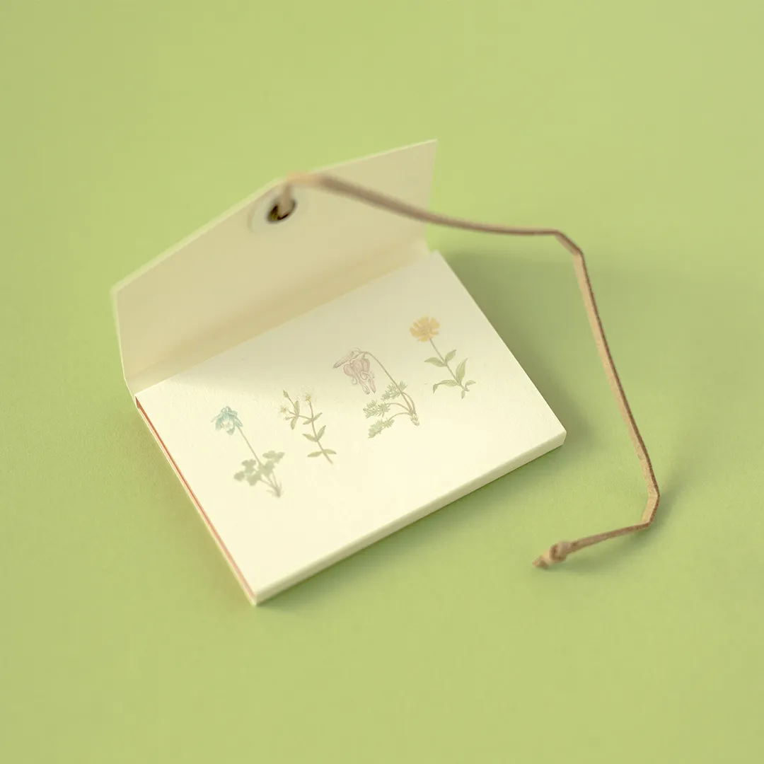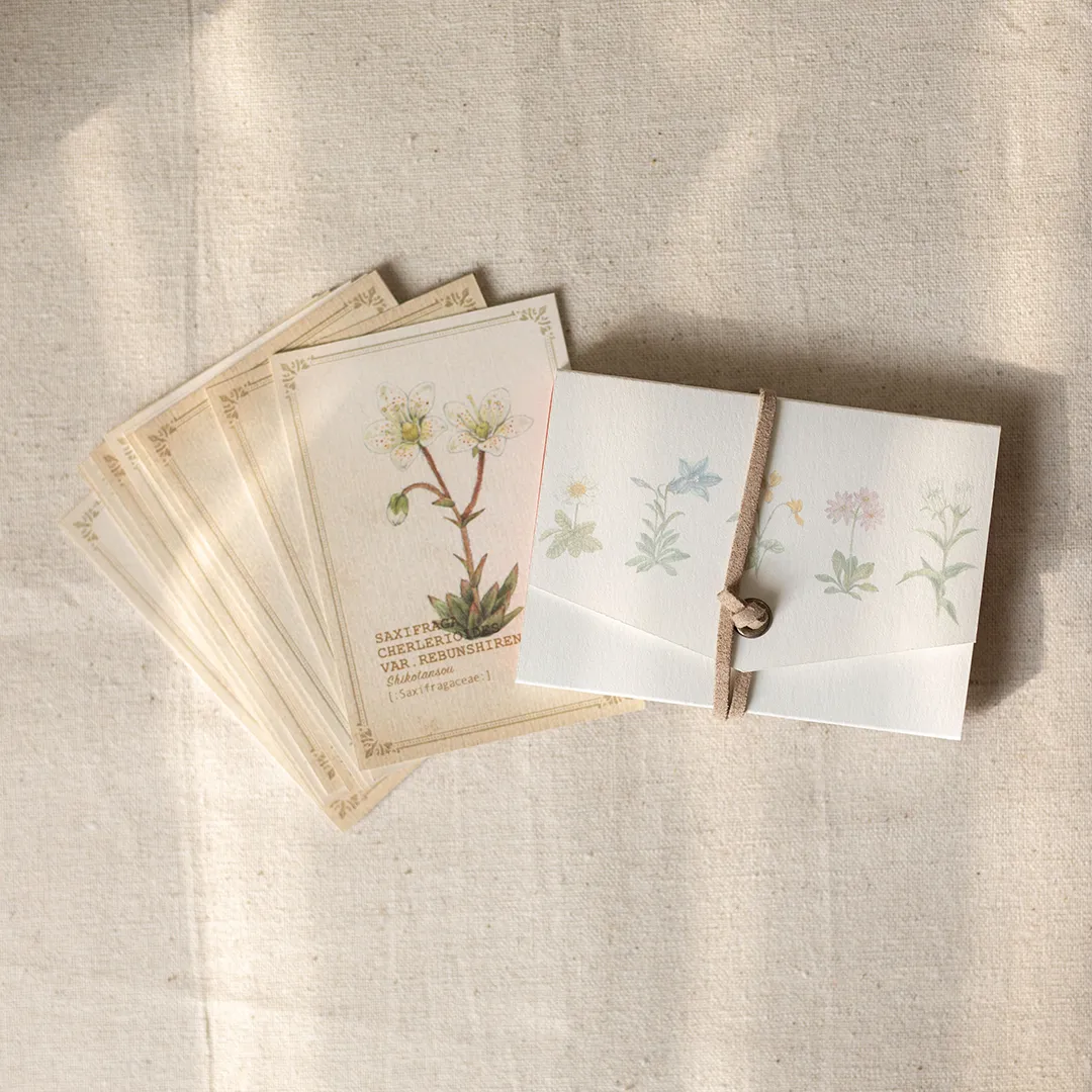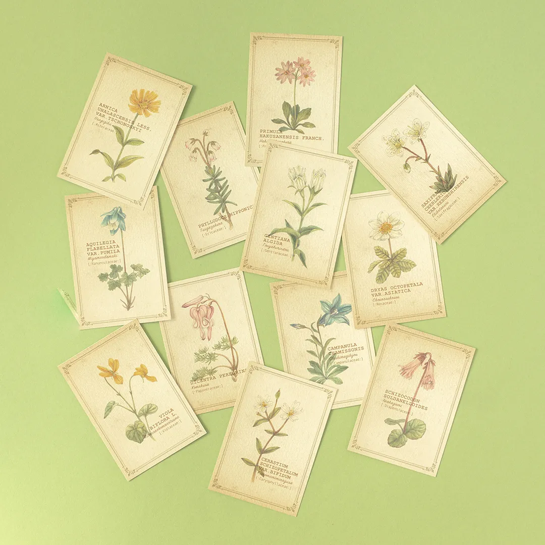 革ひもで閉じられたカードケースの中には、それぞれ異なる高山植物が描かれたカードが12枚入っています。それぞれ、学名、科目、和名がローマ字で添えられており、まるで本物の図鑑のよう。